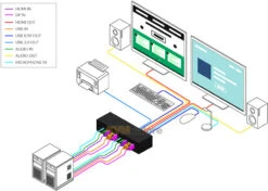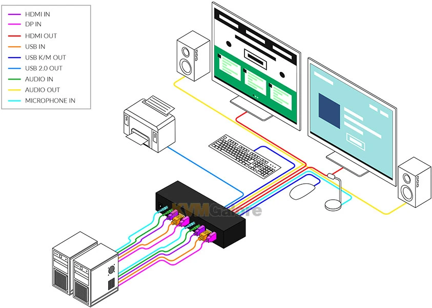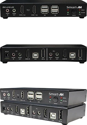 with audio support and USB 2.0 peripheral sharing, to access and control two DisplayPort/HDMI computers from a single USB keyboard/mouse and two HDMI monitors