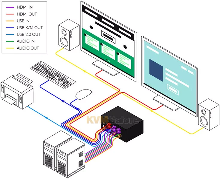 SM-UHN-2D is a KVM switch capable of managing two HDMI computers through two HDMI monitors, one USB keyboard/mouse, and a set of speakers, while sharing USB peripherals like printers, memory devices, scanners, etc.