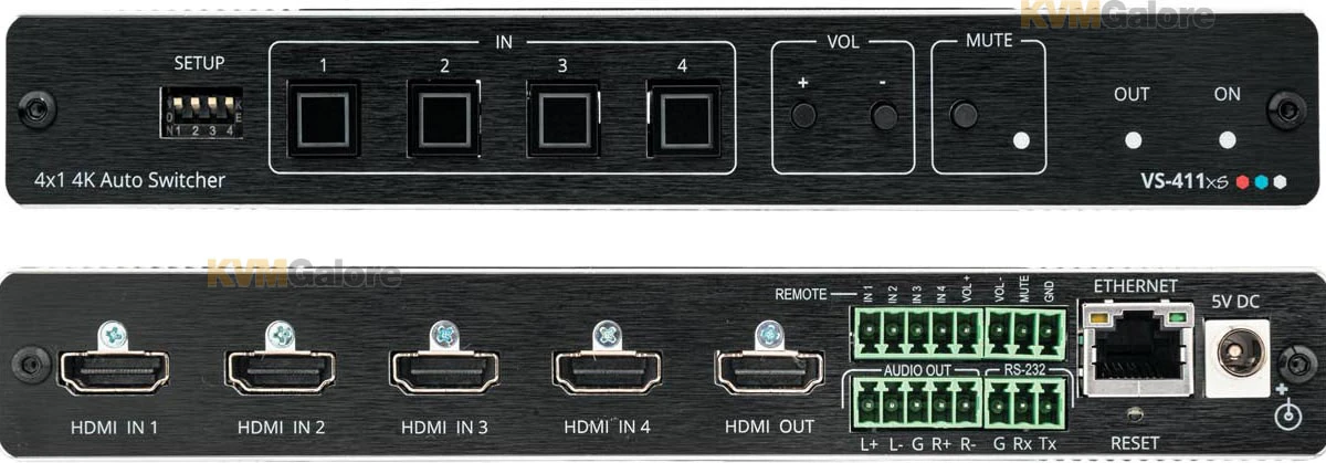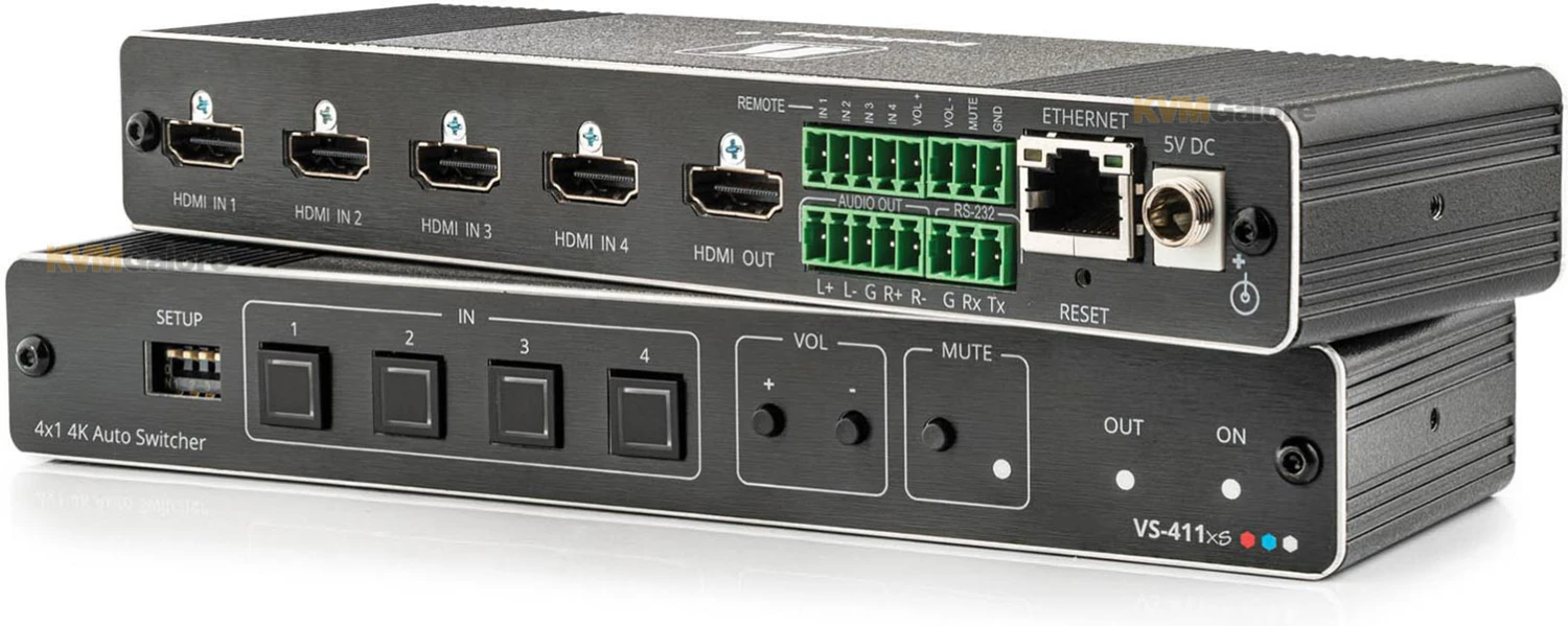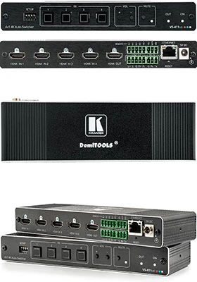 VS-411XS is an intelligent 4×1 automatic switcher for 4K HDR, HDMI video signals. VS-411XS offers an intelligent switching experience with built-in Maestro room control and the standard priority / last-connected switching function based on active video signal detection.