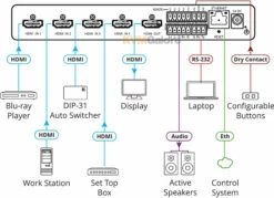 • Cost-effective Maintenance – Status LED indicators for HDMI ports facilitate easy local maintenance and troubleshooting. Remote IP-driven device management, and optional whole site management system, via built in web pages and RS-232 connection. Local and remote firmware upgrade via RS-232 or Ethernet connection tool ensure lasting, field proven deployment.