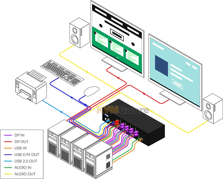 SM-DPN-4D is a dedicated multi-platform KVM switch capable of managing two dual-video computers through two DisplayPort monitors, one USB keyboard, one USB mouse, and other USB 2.0 devices. The dual-head compatibility of the switch enables supervising workflow and monitoring operations.