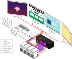 SM-D2H-4Q is a KVM switch capable of managing four 4K DisplayPort computers through four HDMI monitors, USB keyboard & mouse, and a set of speakers.
