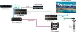 The transmitter unit features an HDMI pass-thru port for integration with local monitors or AV receivers. In addition to HDMI AV, KD-X444LP carries IR or RS-232 for controlling remotely located equipment. An IR sensor and IR emitter are included, and the transmitter unit’s IR input port supports serial IR input directly from a control system / IR block.