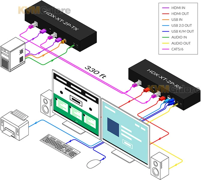 extending 2x uncompressed HDMI videos, USB keyboard/mouse, USB 2.0 peripherals, speakers and microphone, 330 feet over 2x CAT-5e/6/6a cables