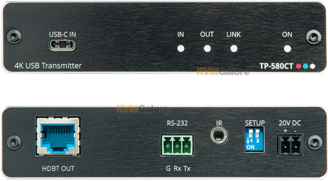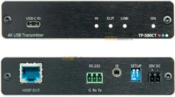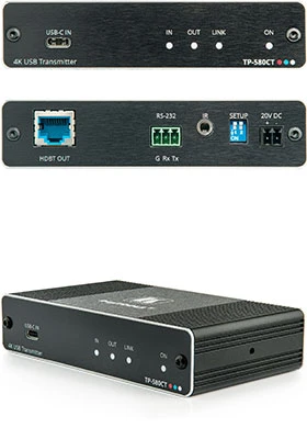 TP-580CT, which is connected directly to USB-C-enabled chargeable sources, is a high-performance, long-reach HDBaseT transmitter for 4K @ 60Hz (4:2:0) USB-C video, RS-232 and IR signals over twisted pair.