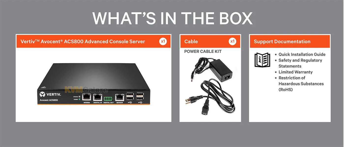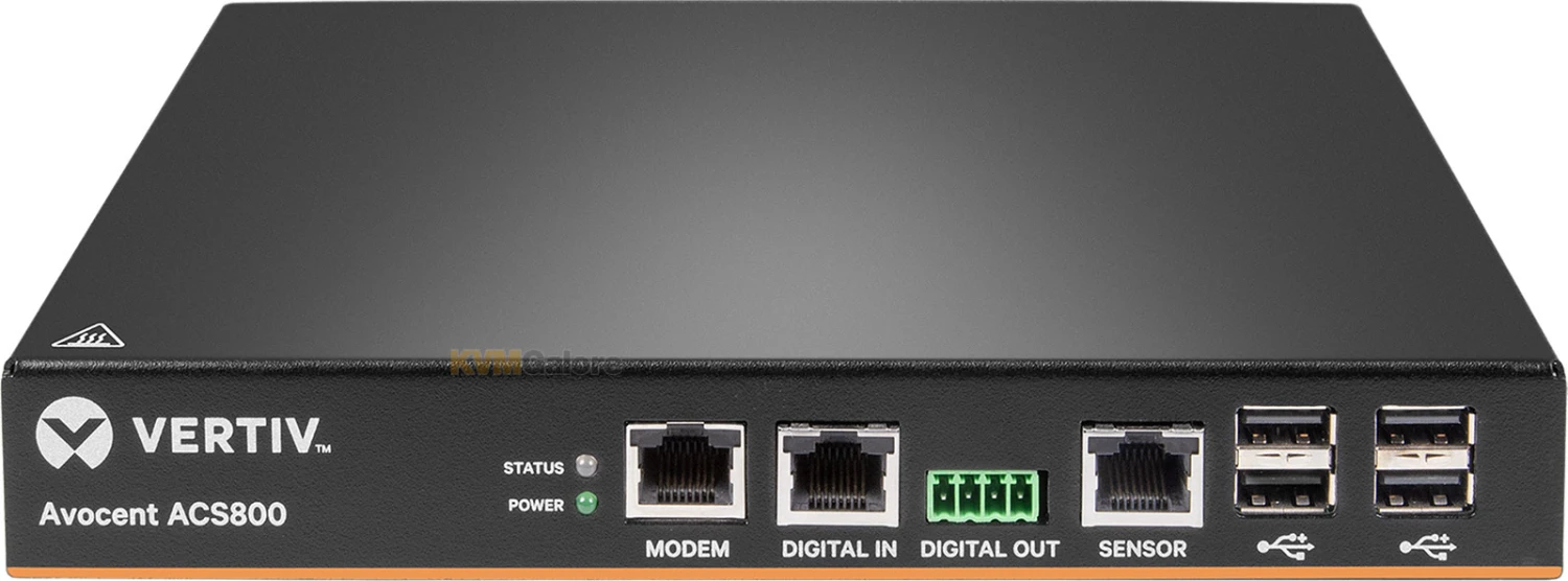 Vertiv Avocent ACS 800 serial console offers upgraded and advanced features that deliver scalable and high performance solutions for IT administrators. The console server features a dual ARM core processor platform with dual gigabit-Ethernet ports and out-of-band network access via a built-in analog modem. In addition, there is an environmental sensor port, to connect a variety of sensors for monitoring and logging on the appliance.