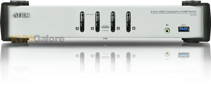 CS1914 4-port USB 3.0 4K DisplayPort KVM switch takes a giant leap forward in KVM switch functionality by combining a KVM switch with a DisplayPort video interface, 2-port USB hub and 2.1 channel audio support for rich bass in surround sound. ATEN CS1914 4-port USB 3.0 4K DisplayPort KVM switch provides the latest innovations in desktop KVM switching technology for the increasing demand of higher video quality and transfer speeds on modern computers. ATEN CS1914 offers unprecedented performance of delivering 4K resolution, the next generation USB 3.1 Gen 1 hub with SuperSpeed 5 Gbps data transfer rates and enhanced user-friendly operations.