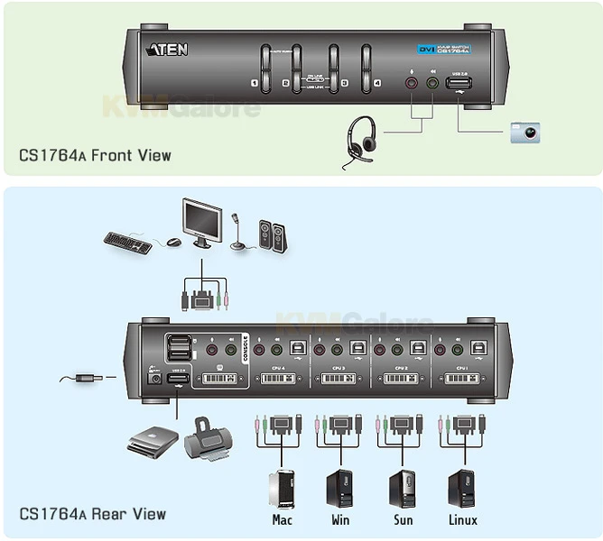 As a KVM switch, the CS1764A allows users to access four computers from a single USB keyboard, USB mouse, and monitor console. As a USB 2.0 hub, it permits each computer to access any peripherals connected to the hub on a ‘one computer at a time’ basis.