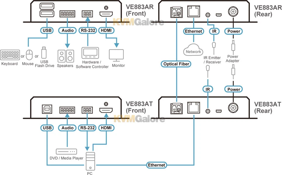 VE883AK2 comes with interfaces of HDMI input / output, analog audio input / output, USB 2.0, IR, RS-232, and Gigabit Ethernet.