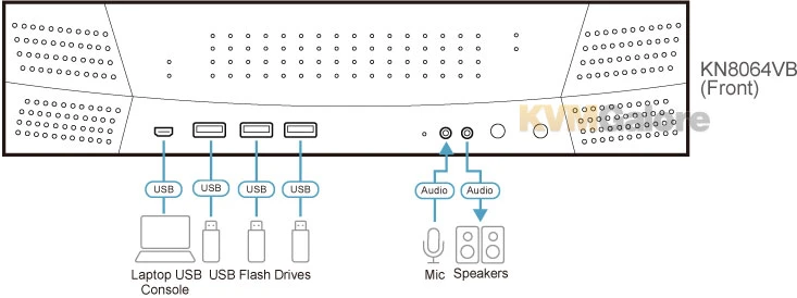 KN8064VB is also audio enabled. Microphone and speakers are supported on the local console for servers connected with dongles that support analog (3.5mm) microphone and speakers. Speakers are supported on the remote users’ computers only for servers connected with HDMI and DisplayPort dongles, as well as with dongles that support analog (3.5mm) speakers. Both microphone and speakers are supported on the remote users’ computers only for servers connected with dongles that support analog (3.5mm) microphone and speakers.