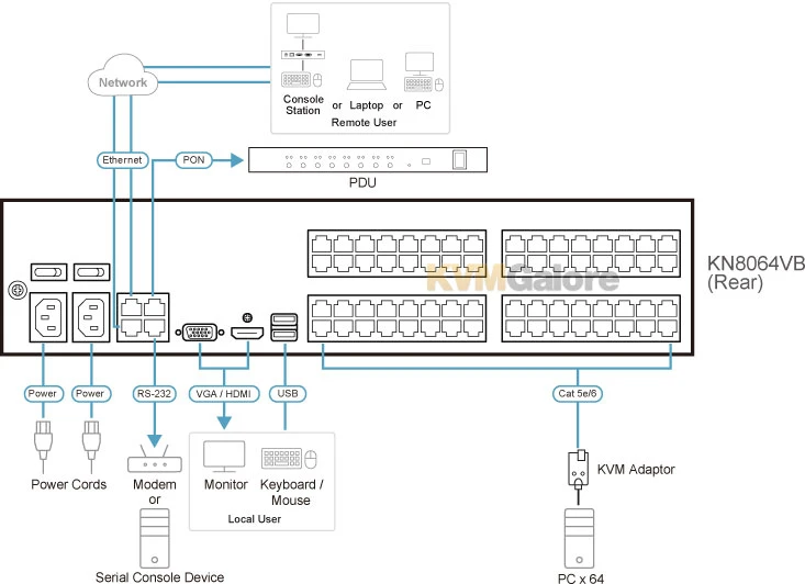 KN8064VB provides out-of-band access with external modem support for BIOS-level troubleshooting when the network is down. It enables IT administrators to manage network devices (e.g. server, storage, router, and switch) in server rooms via management networks that are separate from the main / production networks. If there’s difficulty in accessing the network devices through the production network, the administrators can still access them via the KVM switch. The KVM switch offers several out-of-band access methods, such as a direct console connection from a local computer, a USB console connection from a laptop, a PSTN connection via modem, or a dedicated management network connection via the Ethernet (LAN) port.