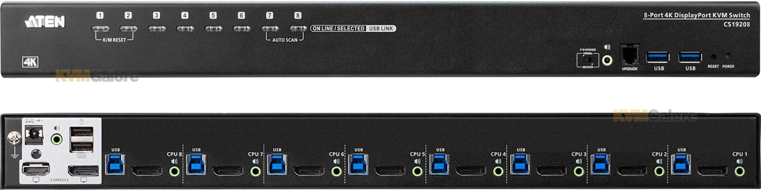 ATEN CS19208 8-port USB 3.0 4K DisplayPort KVM switch can effectively access and control up to 8 DisplayPort computers from a single USB keyboard, USB mouse, and monitor console. With its dual interface console, users can choose between DisplayPort and/or HDMI video output supporting high video quality up to 4K DCI (4096×2160 @ 60Hz), presenting crystal-clear visuals.