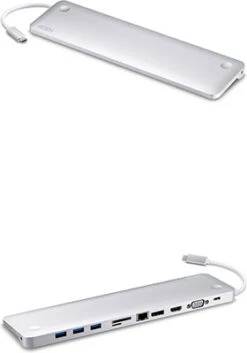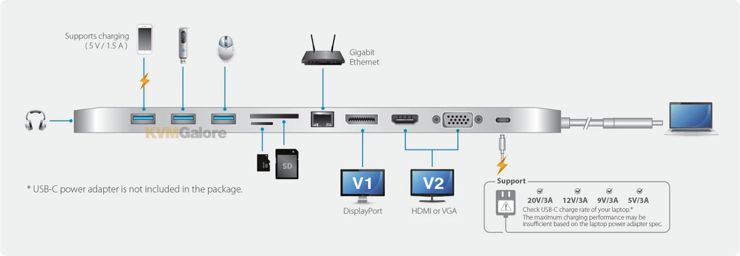 The ultra-sleek ATEN USB-C multiport dock with power pass-through is a one-step total upgrade for your laptop that provides all the extra expansion you need. Simply use one cable to add up to 10 devices with power delivery pass-through to boost your productivity with extra HDMI, DisplayPort, VGA, USB 3.1 Gen1, SD/MMC/MicroSD, Ethernet and audio connections.