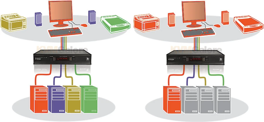 Flexibility is key to the AdderView PRO. The switch enables you to use the KVMA console to work on one computer while your USB peripherals are connected to other computers and your speakers are playing music from yet another. You can of course still switch all connected devices to any one of the connected computers as with any other KVM switch.