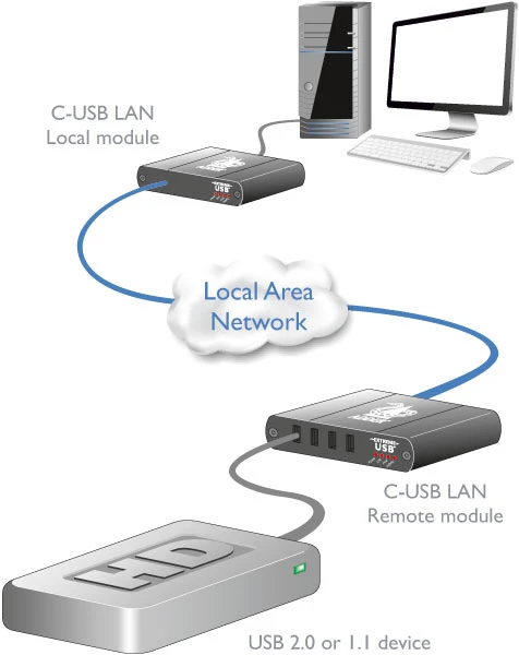C-USB LAN USB 2.0 extender modules allow you to connect up to four USB peripherals (such as flash drives, keyboards, mice and interactive whiteboards) using a standard Local Area Network (LAN) or a direct cable connection up to 328 feet (100m) in length.