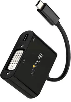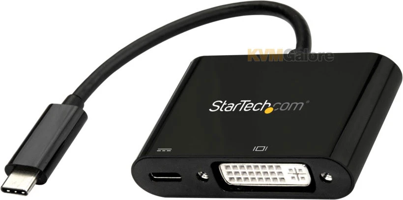 This USB-C to DVI adapter lets you connect a USB-C laptop, such as an Ultrabook™ or MacBook Pro to a DVI display. The video adapter features USB power delivery, which enables you to power and charge your laptop while you’re outputting video to a DVI display.