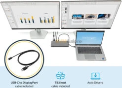 Simply connect the Thunderbolt 3 dock to your laptop with included Thunderbolt 3 cable and start working immediately. No time-consuming driver installations are required.