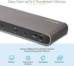 • Connect additional Thunderbolt 3 devices to this Thunderbolt 3 dock including monitors, external hard drive bays, card readers, or an external GPU using the downstream Thunderbolt 3 port