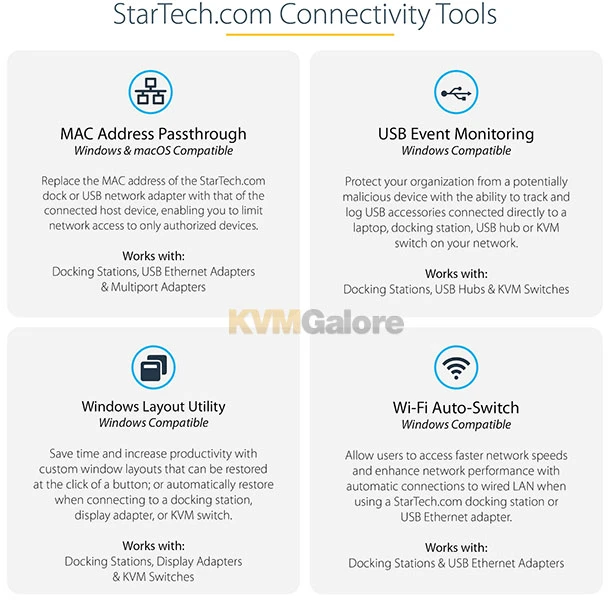 Developed to improve performance and security, StarTech.com Connectivity Tools is the only software suite on the market that works with a wide range of IT connectivity accessories. The software suite includes: