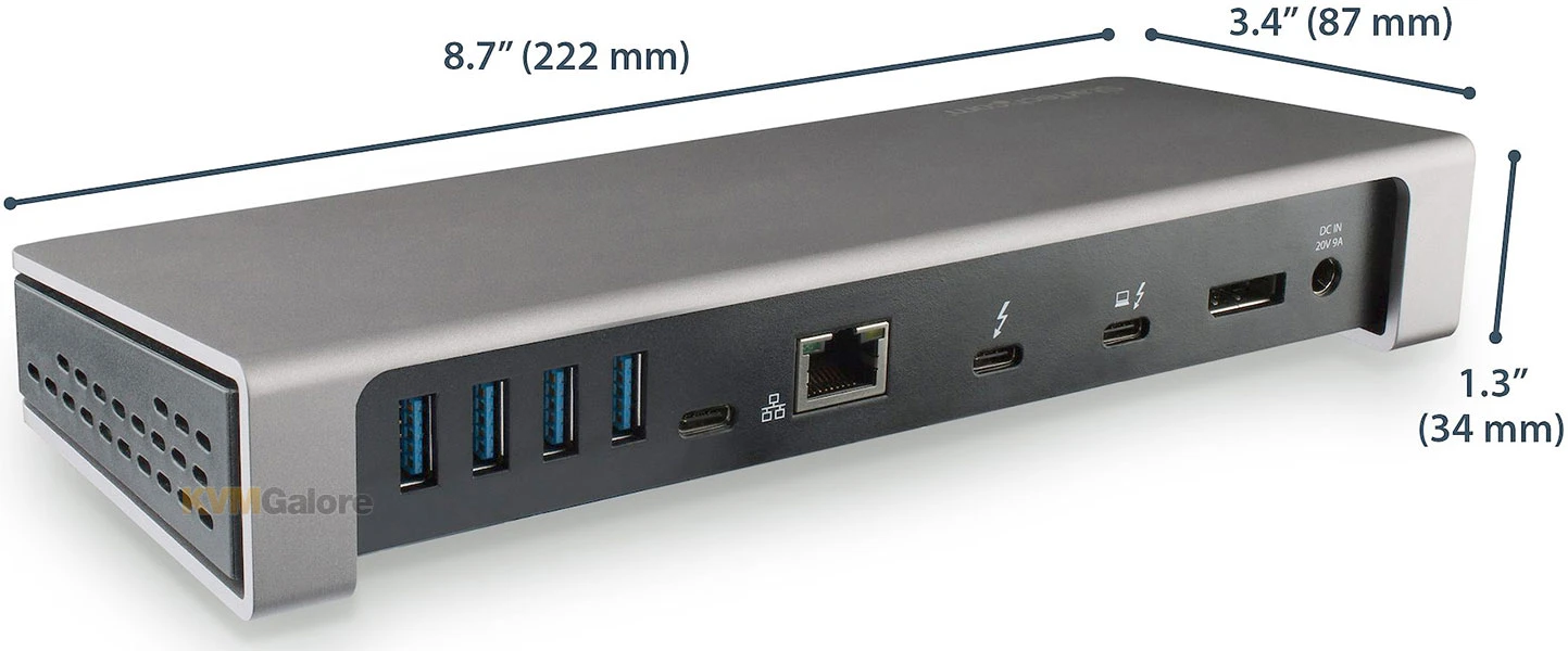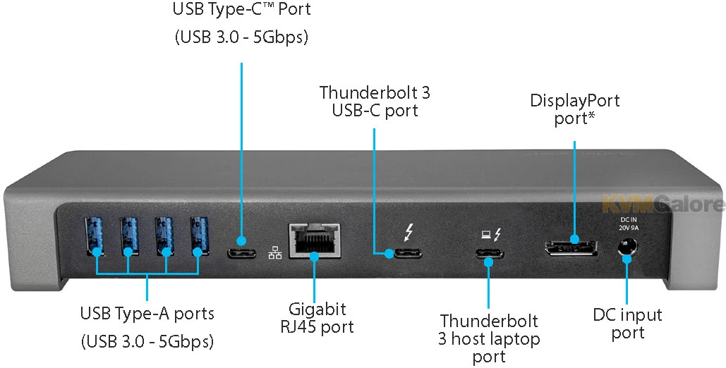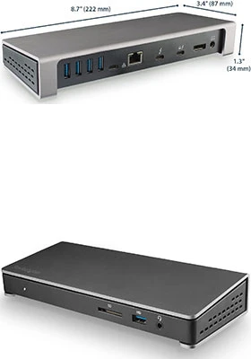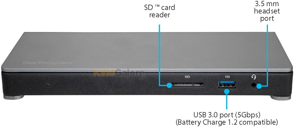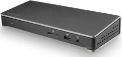 The Thunderbolt 3 docking station offers six USB 3.0 ports, including a Fast-Charge port and USB Type-C port, a GbE Rthernet port and audio/microphone port. The built-in SD card reader adds storage not usually available on most docking stations.