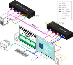 extend two 4K DisplayPort video (from one computer), audio, USB keyboard/mouse and USB 2.0 peripherals up to 328 feet (100m) over 4x CAT-5e/6/6a cables