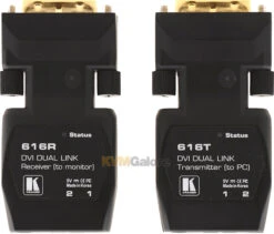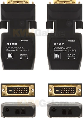 616T converts dual link DVI signals to optical signals that it transmits to 616R. 616R decodes the optical signals back to a dual link DVI signal.