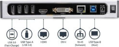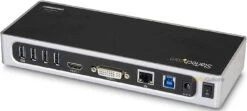 This USB 3.0 docking station for Mac and Windows® laptops gives you display flexibility and the ports you need to maximize workstation performance. The cost-effective dual-monitor docking station provides many video output options including HDMI®, DVI and VGA (with adapter), and gives you six USB ports for peripherals, including two fast-charge USB ports.