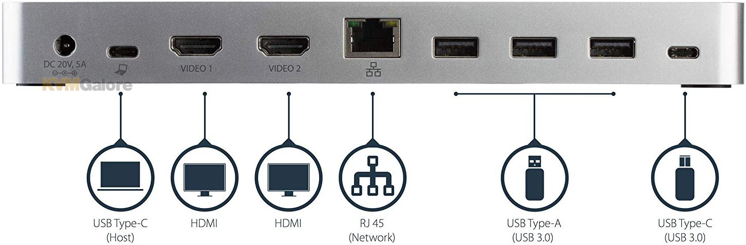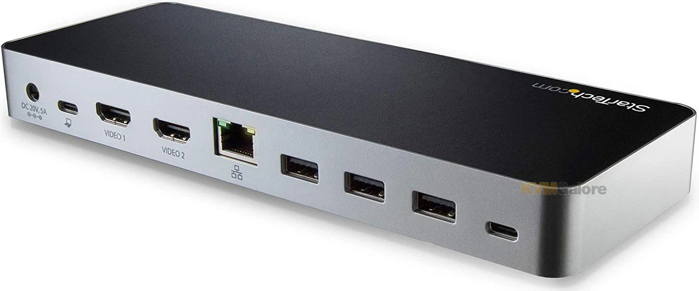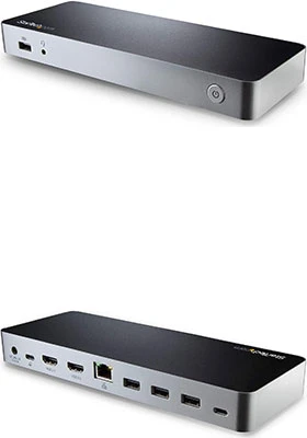 This USB Type-C docking station gives you five USB 3.0 ports (1x USB Type-C and 4x USB Type-A including 1x Fast-Charge), a Gigabit Ethernet port (PXE Boot support), plus an audio headset connections.