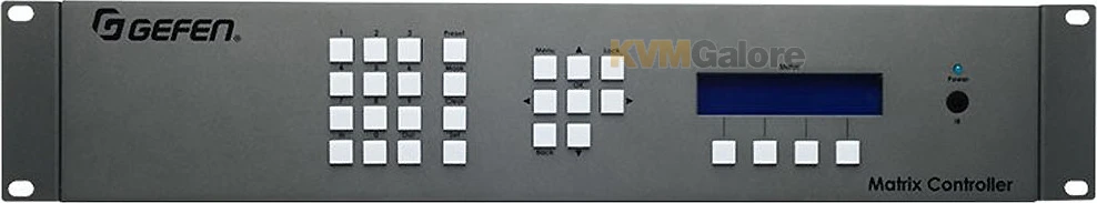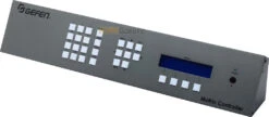 Gefen Matrix Controller’s unique enclosure shape provides flexible installation options. Its slanted front panel enhances user access to push-buttons and provides for better display readability when placed on a conference table. Its 2U tall enclosure and detachable rack ears facilitate installation in a standard 19-inch-wide equipment rack.