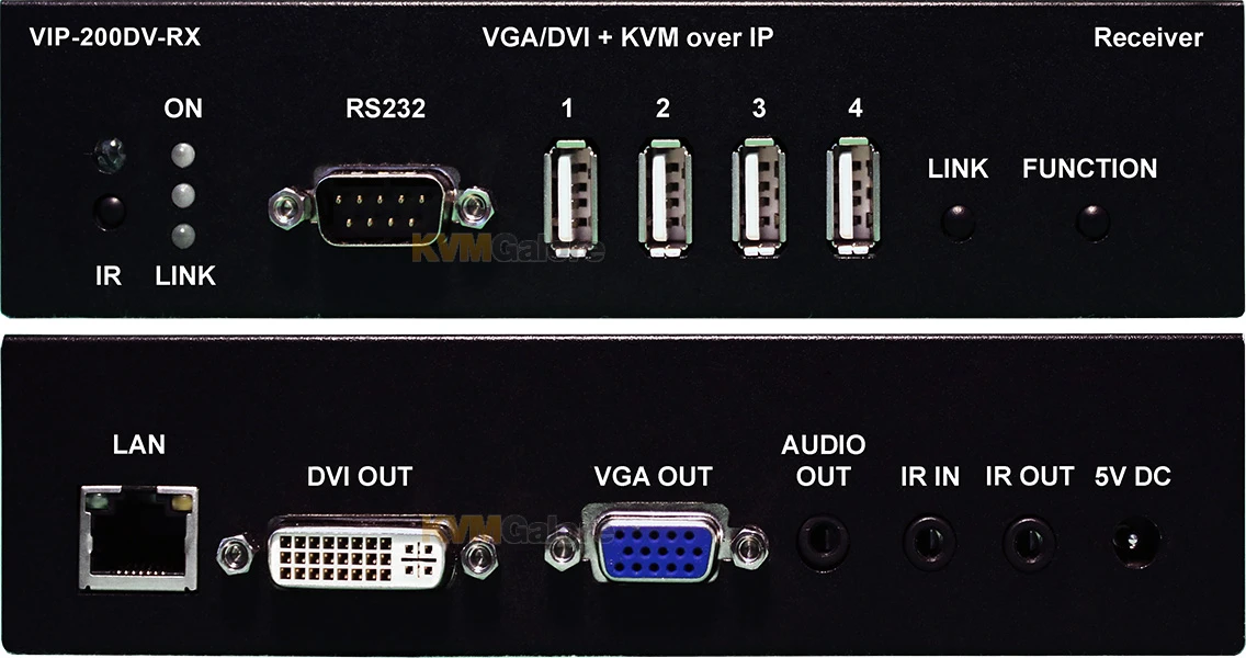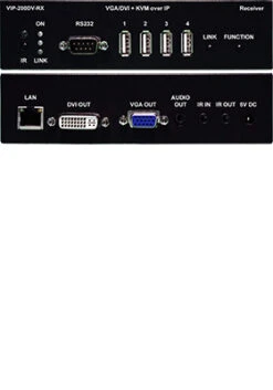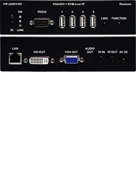 VIP-200DV Rx receiver/decoder module connects to the user-console for point-to-point extension, one-to-many or many-to-one distribution, and matrix switching of multiple devices over IP networks with support for DVI and VGA video, USB, RS-232, IR, and bi-directional audio.
