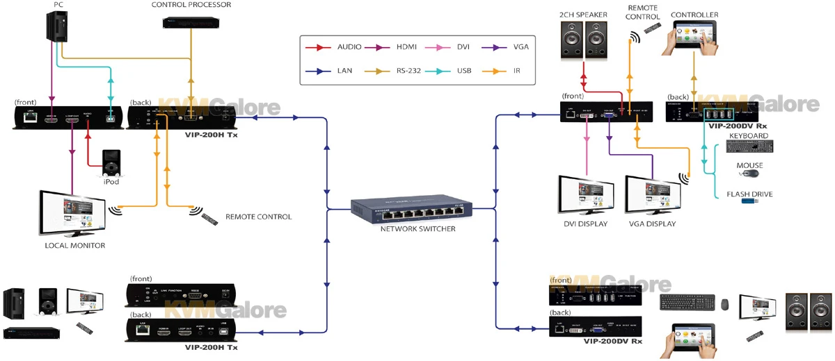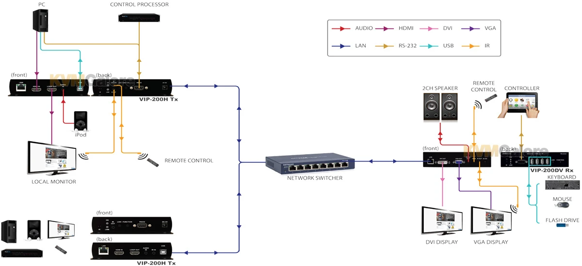 VIP-200 series HDMI and USB/KVM over IP extension system allows users to distribute video, audio, RS-232, infrared (IR), USB keyboard/mouse and USB peripherals over an IP network. Local and remote units can be connected together for point-to-point extension over distances up to 590 feet, as well as a point-to-many, many to point, and matrix connectivity with the assistance of VPX IP video management software (purchased separately).