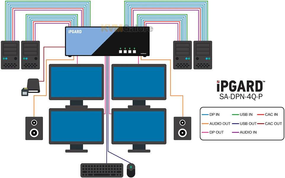SA-DPN-4Q-P supports CAC devices such as smart-card and biometric readers, bolstering security when using the device. However, iPGARD takes CAC security even further, allowing users to assign specific peripheral devices to SA-DPN-4Q-P’s CAC port. Once a peripheral device has been registered by an authenticated admin, users can then switch the connection between that device and the PC’s along with KVM switching.