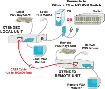 XTENDEX® KVM extender provides local and remote KVM (PS/2 keyboard, PS/2 mouse and VGA monitor) access to a PC or a KVM switch up to 300 feet using CAT-5/5e/6 UTP cable.