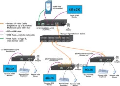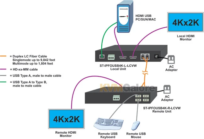 XTENDEX® 4K HDMI USB KVM extender via fiber provides remote KVM (USB keyboard, USB mouse and 4K Ultra-HD HDMI monitor) access to a USB computer up to 9842 feet (3000 meters) away via a duplex LC singlemode fiber optic cable and 1804 feet (550 meters) using multimode fiber optic cable.
