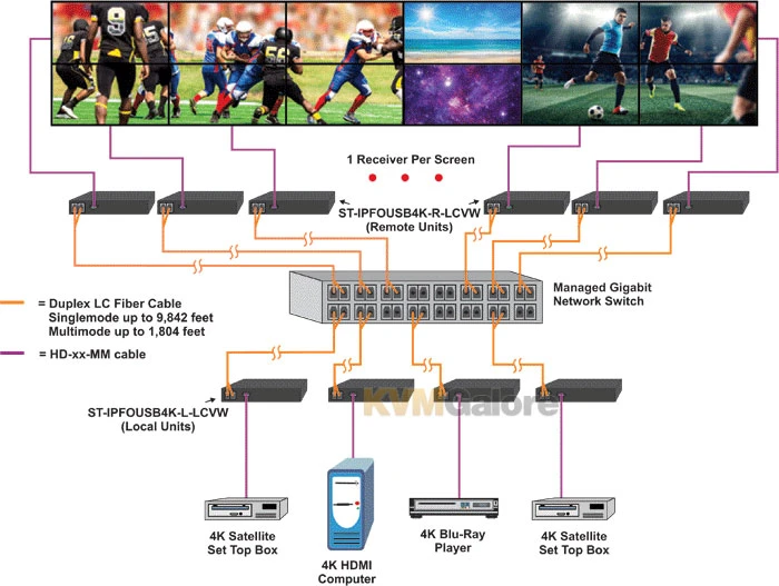 The local and remote units can be connected together for a point-to-point connection via fiber cable, or a point-to-many or many-to-many connection via a managed Gigabit network switch.