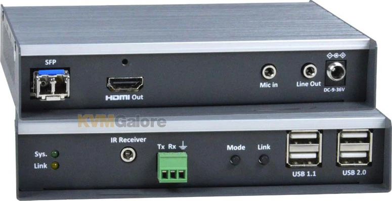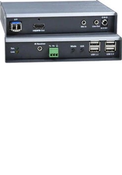 Each KVM extender consists of a local unit that connects to a computer and also supplies video to a local monitor, and a remote unit that connects to an HDMI monitor, 3.5mm stereo audio speakers and microphone, RS232, and up to four USB devices (keyboard, mouse, flash drive, HDD, or touchscreen display).