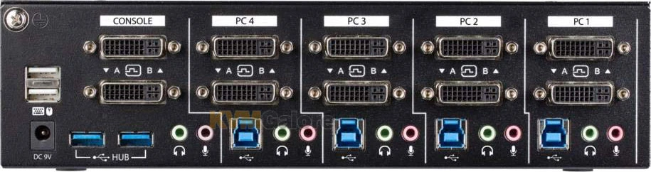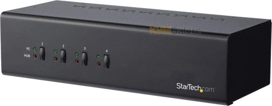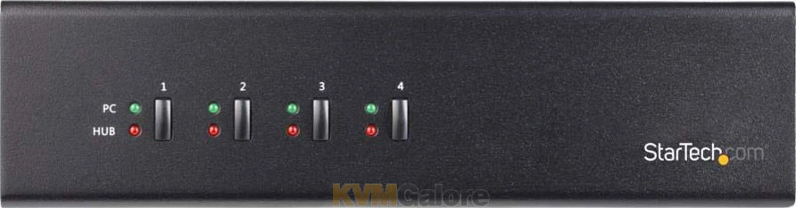 This TAA compliant 4-port dual-monitor single-link DVI USB KVM switch controls up to four PCs, each with two single-link DVI video outputs. The switch also shares one microphone, one set of speakers, one keyboard and one mouse across the four connected computers and features an additional built-in 2 port USB hub.