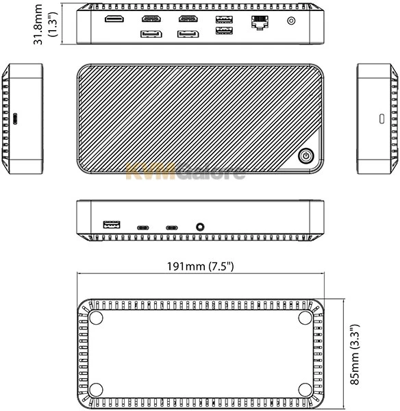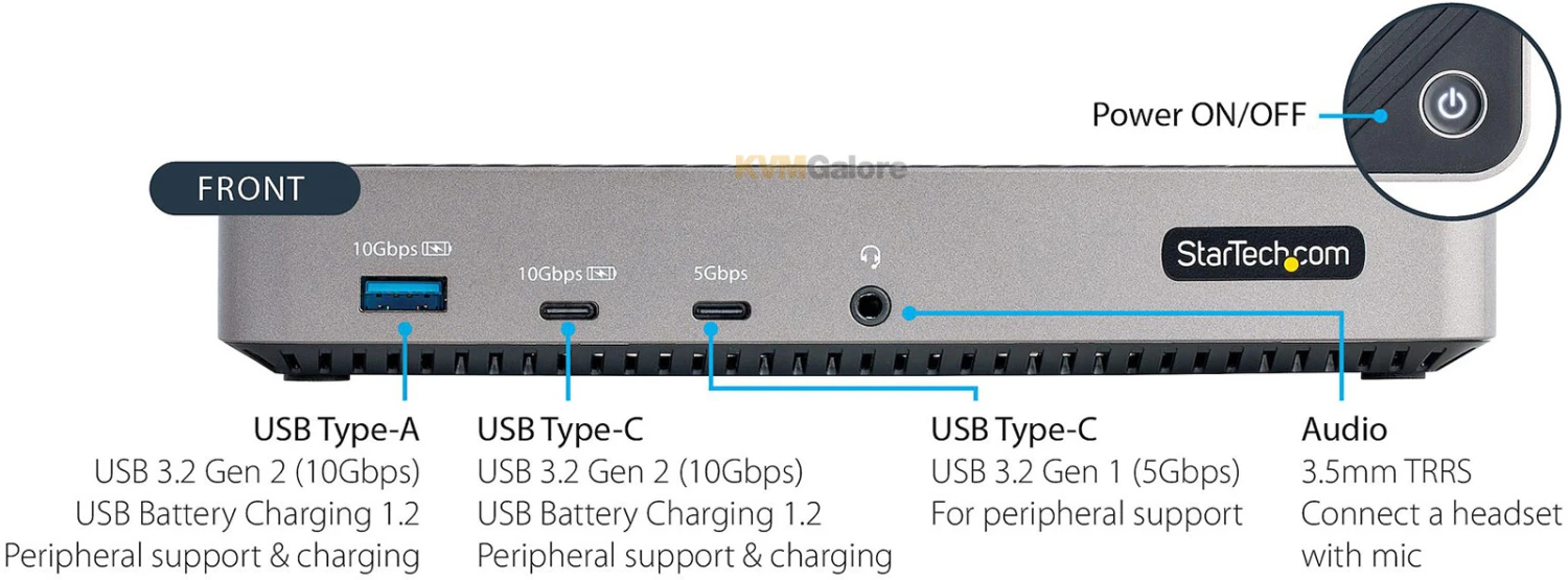 • 5-port USB hub with 3x USB Type-A (2x 5Gbps, 1x 10Gbps w/BC 1.2 charging) and 2x USB Type-C (1x 10Gbps w/BC 1.2, 1x 5Gbps)