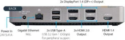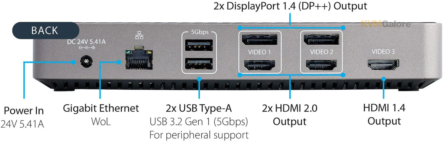 with 2x 4K 60Hz and 1x 4K 30Hz video ports, Gigabit Ethernet, 5x USB 3.0 ports (1x fast-charge), audio, plus 100W Power Delivery laptop charge as you work