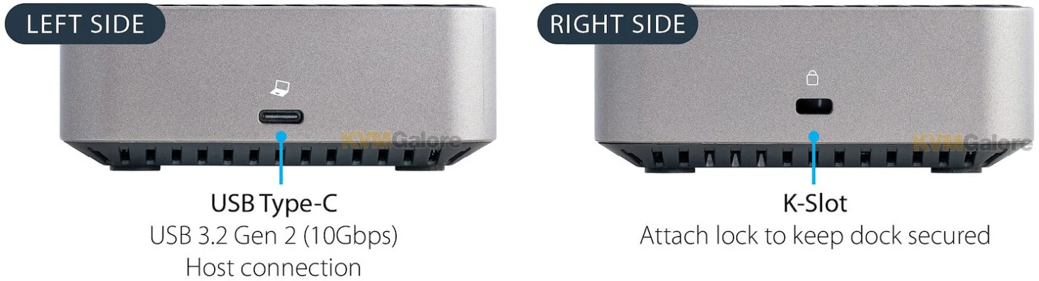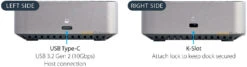 Connect the dock to your host computer using the included 3.3 foot (1m) USB Type-C cable. The docking station supports all major operating systems, including Windows, macOS, ChromeOS, and Ubuntu. This dock was designed for seamless integration with any compatible USB Type-C equipped device within your organization, including Lenovo X1/Thinkpad P Series, Dell Latitudes/Precision/XPS 15, HP Envy, Surface Laptop 3, and M1 Pro/Max/M2 MacBooks. The dock features a side-facing K-Slot for added security in shared workspaces (e.g., BYOD hoteling/hot-desking).