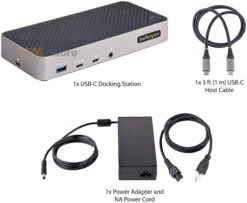 This USB Type-C triple 4K monitor docking station enables wide workstation flexibility, featuring compatibility with USB Type-C or Thunderbolt 3/Thunderbolt 4 laptops, and supporting multiple combinations of Ultra-HD 4K DisplayPort and HDMI monitors.