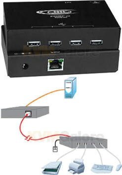 XTENDEX® USB Extender extends four USB devices up to 200 feet using CAT-5/5e/6 cable.