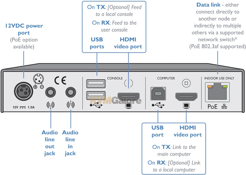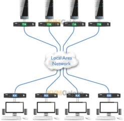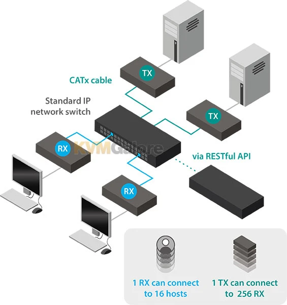 Each XDIP unit can be configured as a simple extender, distributed KVM switch or for AV distribution. Each receiver can see up to 16 sources and each transmitter can connect to up to 256 receivers.